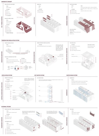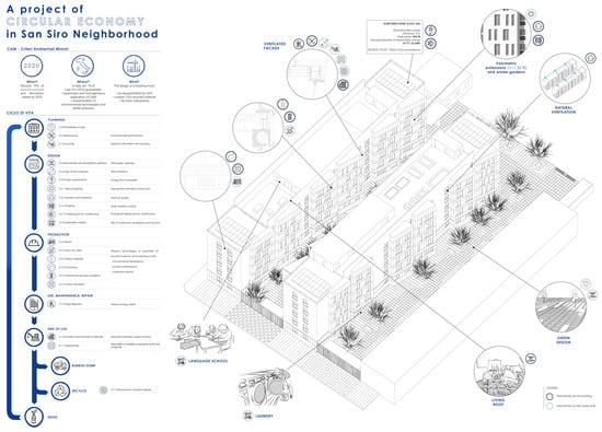Another topic concerns the improvement of the energy performance of the building. ETICS is selected as the main solution for the façade on the main street, to provide a thermal wrapping surface that preserves the original architectonic design as well as to guarantee thermal insulation, waterproofing, and damage reduction with a protective wall coating. In the façades on the courtyard, also the ventilated curtain walls are used. In all cases, natural-based solutions (i.e., wood fiber, cellulose fiber, hemp) or mineral materials (i.e., rockwool and glass fiber) are preferred to ensure a positive life cycle assessment (hereinafter, LCA). The construction materials are selected through a multicriteria approach that considers environmental impacts, thermal performances, acoustic performances, reversibility, maintenance procedures, and economic costs. For example, the energy and environmental concept of the architectural project “Starting from San Siro” is based on circular economy principles, starting from a deep technical and social analysis of the area (Section 4.2, Figure 6). Here, the growing population, the increasing demand for scarce resources, and the spread of poverty can lead to environmental degradation more than other areas. Thus, the construction process focuses on reusing, repairing, refurbishing, and recycling the existing resources, materials, and products to satisfy the social and economic needs of the inhabitants. Using this approach, the selected insulating materials are recycled rubber, wood, bamboo, and so on (Figure 12).