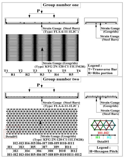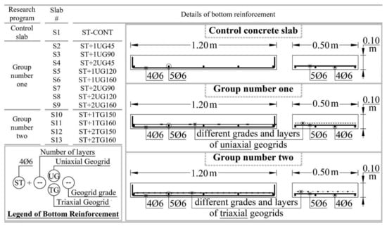 The experimental program of this study included thirteen concrete slabs that had the same dimensions of 120 cm length, 50 cm width, and 10 cm depth. These concrete slabs were prepared, tested, and examined under a four-point loading system until they failed in flexure, and were divided into two groups and one concrete control slab based on the experimental program. All concrete slabs were reinforced by a main minimum bottom steel bars reinforcement of four 6 mm diameter plain steel bars in the longitudinal direction and five 6 mm diameter plain steel bars in the transverse direction in addition to different types, tensile strengths, and layers of geogrids based on the experimental program. Group number one consisted of eight concrete slabs, were reinforced by the main minimum bottom steel bars reinforcement in addition to different tensile strengths, and layers of uniaxial geogrids. Group two consisted of four concrete slabs were reinforced by the main minimum bottom steel bars reinforcement in addition to different tensile strengths, and layers of triaxial geogrids. While the concrete control slab was reinforced only by the main minimum bottom steel bars reinforcement. The concrete slabs reinforcement details per each group are illustrated in detail in Figure 2. It should be mentioned that, as the minimally reinforced concrete sections are brittle structures [28], the decision was made to use the minimum ratio of the bottom reinforcement steel bars in order to: Provide only one flexural crack cross the concrete slab section, and to depend more on the geogrids and deeply study its behavior as additional reinforcement to the steel bars.