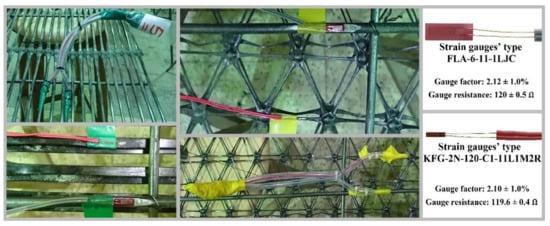 It should be mentioned that, during the fixing of the uniaxial geogrids (UG), it was taken into consideration that the middle part of uniaxial geogrids’ ribs to be located in and matched with the concrete slabs mid-span to allocate the most sensitive tensile part of the uniaxial geogrids’ ribs at the area of the most applied tensile stress during the test; meanwhile, during the fixing of the triaxial geogrids (TG), it was taken into consideration that its transverse direction is to be parallel to the concrete slabs longitudinal directions to provide triaxial geogrids’ ribs in parallel to tensile force direction during the test. Two types of strain gauges were attached to the mid-span of the concrete slabs’ bottom reinforcement. Strain gauges’ type KFG-2N-120-C1-11L1M2R were attached on the bottom surface for the mid-span of geogrids’ ribs. Strain gauges’ type FLA-6-11-1LJC were attached on the bottom surface for the mid-span of reinforcement steel bars. In order to assure strong adhesion between strain gauges and concrete slabs bottom reinforcement, a special single-component adhesive for strain gauges was used, which allows adhesion to metal objects, as well as plastic objects with curing and hardening time under normal conditions from 20 to 60 sec. Because strain gauges are delicate and prone to moisture and mechanical damage, the strain gauges were isolated from heat and moisture by retardant PVC tape. In contrast, the strain gauge wires were isolated by flexible plastic tubes to prevent any damages to the strain gauges. Figure 3 shows the Fixing, isolation, protection, and types of used strain gauges.