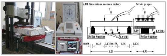 All slabs were loaded and tested under gradually increasing four-point loading by Shimadzu machine with a capacity of 500 kN until they failed in flexure (loading protocol is a displacement control of 2 mm per minute). Each two-line load was applied at one-third of the clear span to provide a constant maximum bending moment and zero shear force in the middle third of the concrete slabs. Two roller-steel supports were used; each one was located at a distance of 7.5 cm from the slab end. Three vertical linear variable differential transducers (LVDTs) were fixed to the slabs to measure the deflection at the mid-span and in places where concentrated forces are applied. A computerized data logger was used to record the measurements of the machine load, the three vertical linear variable differential transducers (LVDTs), and the bottom reinforcement strain gauges. Figure 4 shows the Shimadzu machine, the computerized data logger, and the test set-up details.