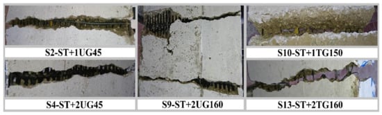 In all concrete slabs, cracks occurred only in the middle third. Accordingly, only flexural cracks were formed, and no shear cracks were formed. The concrete slabs failure developed by the cracks widening, the formation of additional cracks in some slabs, and the extension of these cracks from the concrete bottom surface (tension zone) up to the concrete top surface (compression zone) until failure occurred. Figure 5 shows the slabs’ crack patterns. After the failure of all slabs, the cracks openings were checked to investigate the status of geogrids’ ribs. Figure 6 shows some examples of geogrids’ ribs status after the failure of the concrete slabs. For all uniaxial geogrids (group number one’ case study), no cutting occurred in the uniaxial geogrids’ ribs. For all triaxial geogrids (group number two’ case study), cutting occurred in most of the triaxial geogrids’ ribs. For concrete slab number S1 (the concrete control slab), only one crack was formed and increased gradually until the failure occurred. For group number one, concrete slabs number S2 to S4, only one crack was formed and increased gradually until the failure occurred; meanwhile, for concrete slabs number S5 to S9, two cracks were formed and increased gradually until the failure occurred. For group number two, concrete slabs number S10, to S12, only one crack was formed and increased gradually until the failure occurred; meanwhile, for concrete slab number S13, two cracks were formed and increased gradually until the failure occurred. Accordingly, there is a positive correlation between the number of occurred flexural cracks and the tensile strength of geogrids, as well as the number of geogrids’ layers.
