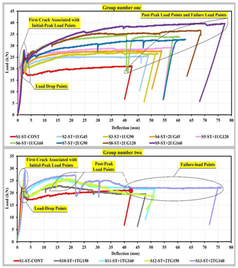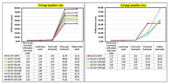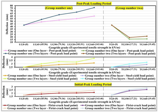 The relation between the deflection at the initial-peak load, the steel yield load or the post-peak load, and the tensile strength of geogrids or the number of geogrids’ layers was studied in detail and presented in Figure 10. It is clear that: It is a positive correlation during the loading period for both cases of using uniaxial geogrid or triaxial geogrid as additional reinforcement to the steel bars. Meanwhile, the cases of using triaxial geogrid as additional reinforcement to the steel bars provided lower deflection values when compared with the uniaxial geogrid, especially for the deflection values at the post-peak load.