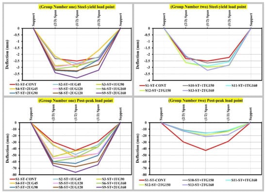 Before the first-crack, most of the tensile force was carried by the concrete section, and the load-deflection relation was a positive linear correlation until the load reached the first-crack. After that, a sudden drop in the load occurred concurrently with a sudden increase in the deflection, due to the used minimum ratio of the bottom reinforcement steel bars, which in turn, led to the inability of the concrete section to carry further tensile force after the first crack. The sudden drop in the load was with a percentage of 19% for the concrete control slab, a percentage varying from 8% to 30% for group number one’ concrete slabs, and a percentage varying from 26% to 32% for group number two’ concrete slabs, with no correlation to the tensile strength of geogrids and the number of geogrids’ layers. The sudden deflection increase was with a percentage of 19% for the concrete control slab, a percentage varying from 7% to 38% for group number one’ concrete slabs, and a percentage varying from 11% to 17% for group number two’ concrete slabs, with no correlation to the tensile strength of geogrids and the number of geogrids’ layers. It should be highlighted that the triaxial geogrids provided a higher sudden load drop percentage concurrently with a lower sudden deflection increase percentage when compared with the uniaxial geogrids. The first-crack was associated with initial-peak load and occurred at a load value of 1.05 times the post-peak load for the concrete control slab, a load value varying from 0.95 to 0.71 times the post-peak load for group number one’ concrete slabs, and a load value varying from 1.12 to 1.03 times the post-peak load for group number two’ concrete slabs. After the first-crack and at the site of crack, the tensile force carried by the concrete section transferred to the bottom reinforcement (geogrids and steel bars), and the concrete slabs recovered its strength and carried a further load, with a non-linear relation to the deflection, leading to a new load raise until the bottom reinforcement steel bars reached the steel-yield load at a load value of 0.87 times the post-peak load for the concrete control slab, a load value varying from 0.80 to 0.63 times the post-peak load for group number one’ concrete slabs, and a load value varying from 0.84 to 0.77 times the post-peak load for group number two’ concrete slabs. After that, the load continues to increase until it reached the post-peak load and providing post-cracking ductility and extra load capacity. The new raise of the load-deflection curve was a slow, gradual increase with a lower correlation slope, due to the decrease of the modulus of elasticity. Furthermore, slight drops in the load may occur due to yield or rupture of one or more geogrids’ ribs, or due to the partial movement of uniaxial geogrids’ transverse bars or triaxial geogrids’ integral nodes. These slight load drops were followed by a sudden load increase, due to the redistribution of the tensile force on the geogrids’ ribs. Figure 7 shows the load-deflection curves per each group concrete slabs in comparison to the concrete control slab. The deflection values at the first-crack load (initial peak load) increased by a percent varying from 9% to 43% for group number one’ concrete slabs, and percent varying from 38% to 62% for group number two’ concrete slabs, compared to the concrete control slab with a weak positive correlation to the tensile strength of geogrids and the number of geogrids’ layers. The deflection values at the steel-yield load increased by a percent varying from 8% to 52% for group number one’ concrete slabs, and percent varying from 6% to 28% for group number two’ concrete slabs, compared to the concrete control slab with a positive correlation to the tensile strength of geogrids and the number of geogrids’ layers. For group number one, the deflection values at the post-peak load increased by a percent varying from 23% to 79% compared to the concrete control slab with a positive correlation to the tensile strength of uniaxial geogrids and the number of uniaxial geogrids’ layers. Meanwhile, for group number two, the deflection values at the post-peak load decreased by a percent varying from 63% to 50% compared to the concrete control slab, while it has a positive correlation to the tensile strength of triaxial geogrids and the number of triaxial geogrids’ layers. Figure 8 shows the deflection values of each group concrete slabs at the concrete slabs’ critical load points compared to the concrete control slab. Figure 9 shows the deflection patterns of each group concrete slabs at the steel-yield load and post-peak load compared to the concrete control slab. It should be highlighted that concrete slab number S13 provided a higher increment of the deflection at failure load, due to the occurring of two flexural crack, not one crack compared to the other group number two’ concrete slabs, which in turn increased the number of contributed triaxial geogrids’ hexagon pitches to carry the tensile force; meanwhile, for group number one, the gradual increase of uniaxial geogrids’ ribs portions contributing to carrying the tensile force led to a gradual increment of the deflection. It should be highlighted that for group number two, the occurred numerous triaxial geogrids’ ribs cutting led to a gradual decrease of load after the post-peak load followed by a large incremental increase of the deflection until the cutting of the most of ribs then the failure occurred; meanwhile, for the group number one, as no uniaxial geogrids’ ribs were cutting occurred the post-load increased gradually until the post-peak load then the failure occurred.