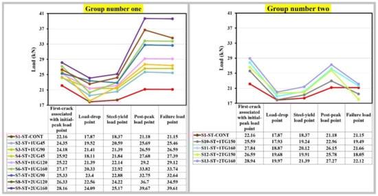 First-crack load (initial-peak load), steel-yield load, and post-peak load were recorded, and post-peak flexural strength values were calculated from equation-1. The first-crack load (initial peak load) values increased by a percent varying from 10% to 27% for group number one’ concrete slabs, and percent varying from 15% to 31% for group number two’ concrete slabs, compared to the concrete control slab with a weak positive correlation to the tensile strength of geogrids and the number of geogrids’ layers. The steel-yield load values increased by a percent varying from 12% to 37% for group number one’ concrete slabs, and percent varying from 5% to 16% for group number two’ concrete slabs, compared to the concrete control slab with a positive correlation to the tensile strength of geogrids and the number of geogrids’ layers. The post-peak load values increased by a percent varying from 21% to 87% for group number one’ concrete slabs, and percent varying from 8% to 29% for group number two’ concrete slabs, compared to the concrete control slab with a positive correlation to the tensile strength of geogrids and the number of geogrids’ layers. Figure 11 shows load values at different critical points per each group concrete slabs compared to the control slab. Figure 12 shows the values of the post-peak flexural strength for each concrete slab compared to the concrete control slab.