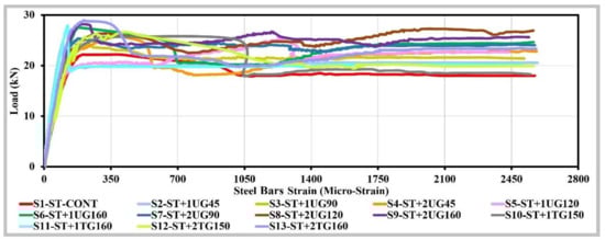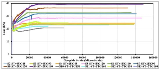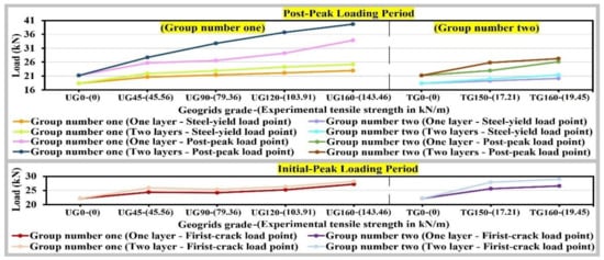 The relation between initial-peak load, steel yield load, or post-peak load, and the tensile strength of geogrids or the number of geogrids’ layers was studied in detail and presented in Figure 13. It is clear that there is a weak positive correlation during the initial-Peak loading period, while it changed gradually through the post-weak loading period to be a positive correlation at the post-peak load. Meanwhile, the cases of using triaxial geogrids as additional reinforcement to the steel bars provided higher first-crack load (initial-peak load), lower steel-yield load, and lower post-peak load values when compared with the uniaxial geogrid.