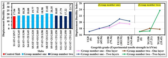 The structural element ductility might be defined by its ability to deform under large deflection at or near the failure load without a significant reduction in its strength, providing an adequate warning before failure. Concrete structures should maintain the strength above the yield strength up to at least the allowable plastic deformation adopted in the design that allows a certain degree of damage during earthquakes; therefore, it becomes necessary to provide a sufficient amount of ductility to concrete structures so that they should not collapse during the expected earthquakes [29]. The displacement ductility index is the ratio of the deflection value at failure (ultimate state) to the deflection value of the steel-yield or the first-crack [30]. The displacement ductility index under this study was calculated as the ratio of deflection at the concrete slab failure to the deflection at the bottom reinforcement steel-yield load. The displacement ductility indexes were increased by a percent varying from 6% to 23% for group number one’ concrete slabs, compared to the concrete control slab with a positive correlation to the tensile strength of uniaxial geogrids and the number of uniaxial geogrids’ layers, while it was increased by a percent equal to 6%, 4%, 1%, and 31% for group number two’ concrete slabs numbers S10, S11, S12, and S13, respectively, compared to the concrete control slab with a weak positive correlation to the tensile strength of triaxial geogrids and the number of triaxial geogrids’ layers, as shown in Figure 14. The one and two layers of uniaxial geogrids with the experimental tensile strength of 103.91 kN/m and 143.46 kN/m provide more efficient utilization as they had higher displacement ductility index values when compared to the other geogrids’ cases, as shown in Figure 14, Except for S13. As S13 provided a higher increment of the deflection at failure load, due to the occurring of two flexural crack (not one crack), which in turn increased the number of contributed triaxial geogrids’ hexagon pitches to carry the tensile force, consequently, provided a higher increment of the displacement ductility index compared to the other group number two’ concrete slabs; meanwhile, for group number one, the gradual increase of uniaxial geogrids’ ribs portions contributing to carrying the tensile force led to a gradual increment of the displacement ductility index.