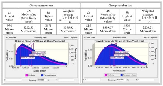 After the load drop point, the strain value of geogrids at the steel-yield load (at a steel-yield strain of 1485 micro-strain) increased gradually to reach a strain value varying from 974 to 3471 micro-strain for group number one’ concrete slabs. A strain value varying from 194 to 4806 micro-strain for group number two’ concrete slabs, with no correlation to the tensile strength of geogrids and the number of geogrids’ layers. After the steel-yield load point of group number one’ concrete slabs, the strain values of uniaxial geogrids increased gradually to reach the proposed uniaxial geogrids-yield strain by the manufacturer at a load value varying from 88% to 90% of the post-peak load for concrete slabs number S2 to S4, and at a load value varying from 97% to 99% of the post-peak load for concrete slabs number S5 to S9, with no correlation to the tensile strength of uniaxial geogrids and the number of uniaxial geogrids’ layers. It should be mention that, for concrete slabs number S2 to S4, only one crack occurred; meanwhile, for concrete slabs number S5 to S9, two cracks occurred, leading to increasing the contributed uniaxial geogrids’ ribs portions to carry tensile forces, accordingly, the increasing of the number of flexural cracks leading to increase the uniaxial geogrids-yield load. After the steel-yield load point of group number two’ concrete slabs, the strain values of triaxial geogrids increased gradually to reach a strain value equal to 58783, 40968, 26721, and 237 micro-strain at load value equal to 90%, 84%, 100%, and 100% of the post-peak load for S10, S11, S12, and S13, respectively, with no correlation to the tensile strength of triaxial geogrids and the number of triaxial geogrids’ layers. It should be mentioned that, for concrete slab number S13, the value of triaxial geogrids was very low because (as highlighted above) the ability of triaxial geogrids’ ribs to carry tensile forces is restricted to hexagon pitches where the flexural cracks developed. The recorded range of geogrids strain value corresponding to the bottom reinforcement steel-yield strain had no impact on the concrete slabs’ overall performance, indicating that the tensile force was not distributed uniformly to the geogrids’ ribs. Which, in turn, indicates the existence of numerous possible strain values in the remaining geogrids’ ribs of the same concrete slab. This also indicated that, if the test was repeated for the same concrete slab reinforcement details and with the same conditions, there would be many numbers of strain values possibilities varying from 974 to 3471 micro-strain for uniaxial geogrids and a strain values possibilities varying from 815 to 4806 micro-strain for triaxial geogrids corresponding to the steel-yield strain, due to the random distribution of tensile force to the geogrids’ ribs. It should be mentioned that the strain record of S13 was excluded from the possibilities range of triaxial geogrids because, as highlighted above, the flexural cracks were not in hexagon pitches where the strain gauge was attached. Accordingly, a probability distribution analysis was done for the corresponding uniaxial geogrids, and triaxial geogrids strain values to bottom reinforcement steel-yield load, to provide a more accurate value of it, as shown in Figure 19. The probability distribution analysis results indicated that for the uniaxial geogrids, the weighted average value was equal to 1576.05 micro-strain (0.16%), the mean value was equal to 1789.38 micro-strain (0.18%), and the median value was equal to 1666.15 micro-strain (0.17%); meanwhile, for the triaxial geogrids, the weighted average value was equal to 2203.21 micro-strain (0.22%), the mean value was equal to 2204.38 micro-strain (0.22%), and the median value was equal to 2132.39 micro-strain (0.21%). The experimental yield strain of reinforcement steel bars was 1485 micro-strain (0.15%), as shown in Table 2, which nearly equal to the uniaxial geogrids and the triaxial geogrids strain probability distribution analysis results. The uniaxial geogrids’ theoretical yield strain value is 130000 micro-strain (13%—by manufacturer), and the triaxial geogrids’ numerical yield strain value is 64000 micro-strain (6.4%—[27]), which are very far from the concrete slabs elastic range, and acceptable plastic range, so the definition of geogrids’ proof-strain was decided to be used when the geogrids will be used as concrete slab reinforcement, to be sure that the geogrids reinforced concrete slabs will not exceed the elastic range or an acceptable plastic range. Accordingly, the geogrids’ proof-strain value was determined to be equal to the reinforcement steel-yield strain value (which varies from 1250 (0.13%) to 2500 (0.25%) micro-stain based on the steel grade), when it is used as an additional reinforcement to the reinforcement steel bars, which will keep the geogrids reinforced concrete slab in the elastic range or an acceptable plastic range.