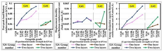 • The using of uniaxial geogrids as additional reinforcement to the steel bars provide more efficient utilization than the using of triaxial geogrids as additional reinforcement to the steel bars as it has higher benefits to cost ratios, especially for uniaxial geogrids with the experimental tensile strength of 103.91 kN/m and 143.46 kN/m, as it has the highest benefits values (steel yield load, post-peak load, displacement ductility index, and energy absorption capacity), while they provided benefit to cost values higher than the lower uniaxial geogrids’ tensile strength. Meanwhile, the triaxial geogrids provided lower deflection values, especially for the deflection at the post-peak load.