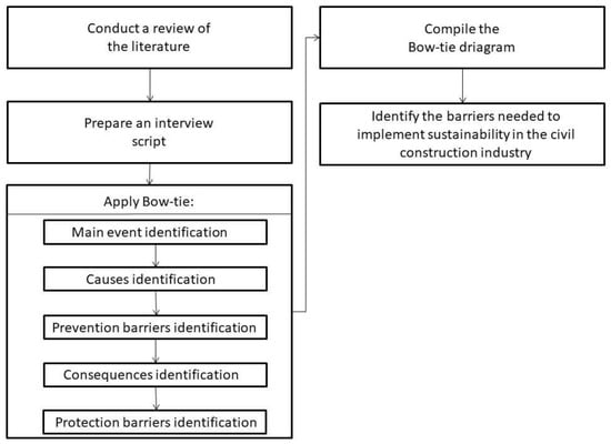 In this context, this paper aims to present a structured methodology to deal with the problem of implementing sustainability in civil construction based on the bow-tie tool. It provides a structured analysis, with gains in visualizing information and in defining preventive and mitigation actions [,]. Previous studies have used bow-tie in other areas, such as to assess accidents at work on oil platforms [], in the health sector [] and in the naval industry []. Despite the help that this tool offers, bow-tie is not widely used in the construction industry, thus reinforcing the relevance of this study, which is to contribute towards making more assertive management decisions, since DMs will have a better understanding of the event itself.