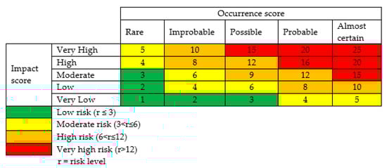 Risk scores were calculated by multiplying the impact score by the occurrence score, using a scale from 1 × 1 = 1 to 5 × 5 = 25. As can be seen in the matrix (Figure 2), the risk assessed can be classified into up to four levels: very low risks (low risk, green part of the matrix); tolerable risks (moderate and high risks, yellow and orange parts of the matrix, respectively); and intolerable or unacceptable risks (very high risk, red part of the matrix). In the problem in question, a score of 15 was obtained (moderate impact scale = 3 x almost certain occurrence scale = 5), one being considered a very high risk. High risk requires protection barriers to minimize the impact on the environment, and they should be brought into use as soon as possible.