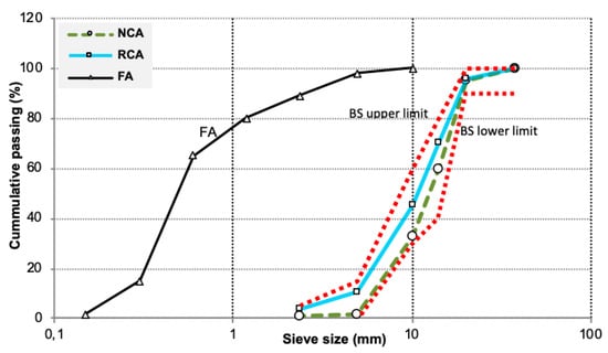 CEM I 42.5 N Normal Portland cement (PC) in accordance with BS EN 197-1 [28] and equivalent to ASTM C150 Type I [29] was used in all concrete mixes. Natural siliceous gravel having a maximum size of 20 mm, a density of 2.54 and a water absorption capacity of 0.61% was used as coarse aggregate. River sand has a density of 2.68, a fineness modulus of 2.6, a water absorption capacity of 0.81%, and nominal sizes of 0–5 mm were used as fine aggregate. The coarse RCA used in this study were provided by a commercial recycling plant. The produced RCA 5–20 mm coarse aggregates are derived from concrete debris that are collected from different construction and demolition waste sites. The physical and mechanical properties of these coarse and fine aggregates used are given in Table 1. The RCA employed in this study conforms to the BS 8500-2: 2015 [30] requirements in terms of constituents of RCA used in concrete production. The gradation of natural and recycled aggregates used is conducted as per BS EN 933-12012 [31], and the gradation curves are shown in Figure 1. Both natural and recycled coarse aggregates fit well within the requirements’ limits for aggregates for concrete specified by BS 882:1992 [32] and BS EN 12620:2002 [33].