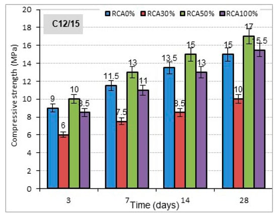 Compressive strength development for C12/15 concretes with various proportions of RCA.