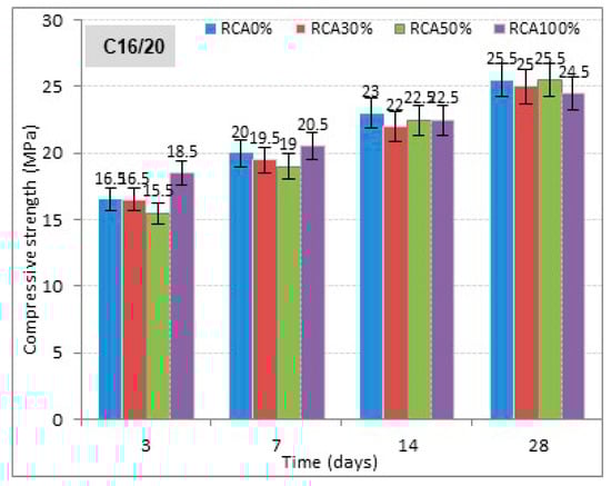 Compressive strength development for C16/20 concretes with various proportions of RCA.