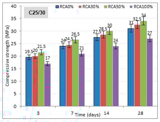 Compressive strength development for C25/30 concretes with various proportions of RCA.