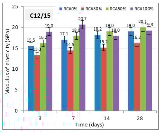Effect of proportions of RCA on the modulus of elasticity development for C12/15 concretes.