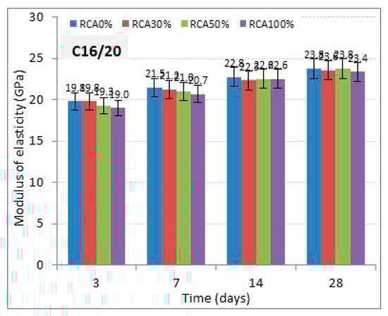 Effect of proportions of RCA on the modulus of elasticity development for C16/20 concretes.