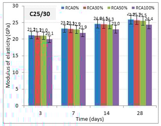 Effect of proportions of RCA on the modulus of elasticity development for C25/30 concretes.