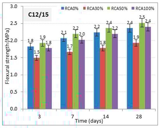 Effect of RCA content on the flexural strength development for C12/15 concretes.