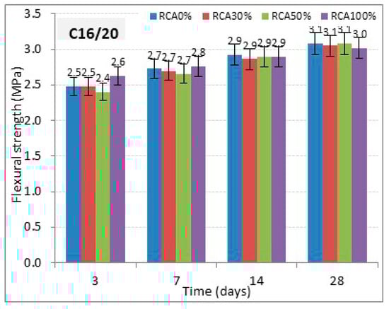 Effect of RCA content on the flexural strength development for C16/20 concretes.