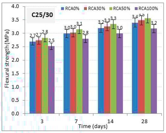 Effect of RCA content on the flexural strength development for C25/30 concretes.