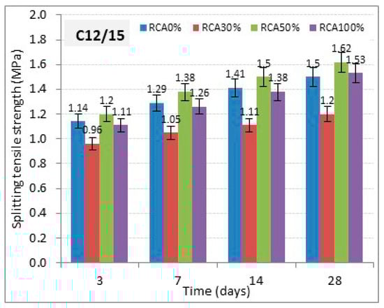 Effect of RCA content on the splitting tensile strength development for C12/15 concretes.