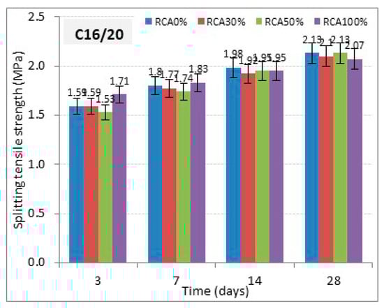 Effect of RCA content on the splitting tensile strength development for C16/20 concretes.