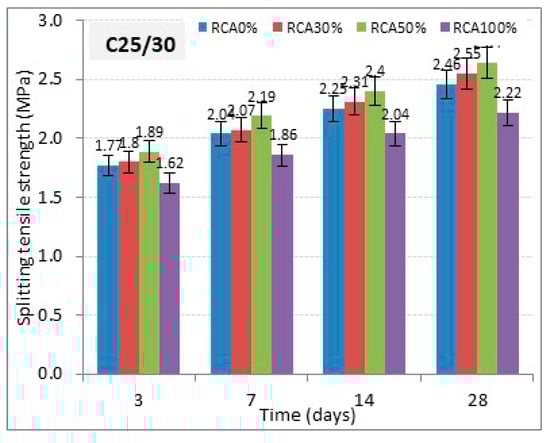 Effect of RCA content on the splitting tensile strength development for C25/30 concretes.