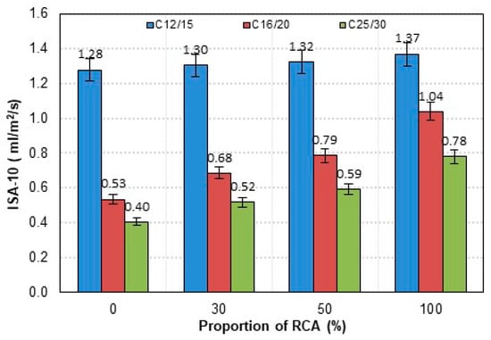 The ISA-10 test results of the control and RCA-concretes designed with various RCA contents are presented in Figure 14. Embedding various amounts of RCA as part or even full substitution of NCA increased the ISA-10 as could be seen in Figure 10. The higher the substitution ratio of the RCA, the higher the ISA-10 of the concrete. The increase in ISA-10 was more noticeable for C12/15 as compared to C16/20 and C25/30. For the three grades of concrete investigated, using 30% RCA showed no significant increase in the ISA-10, while beyond this content, the ISA-10 increased rapidly. The increase in the ISA-10 of the RCA-concrete is due to the highly porous and absorptive nature of the RCA used.