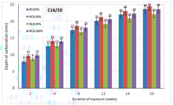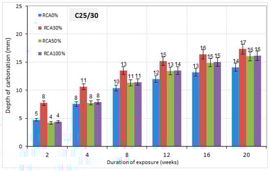 The process of concrete carbonation involves the formation of calcite (CaCO3) as a result of the reaction between the calcium hydroxide (Ca(OH)2) from cement hydration and carbon dioxide (CO2). Figure 15 and Figure 16 display the results of carbonation depth for C16/20 and C25/30 concretes. The carbonation depth is proportionate to the CO2 concentration and time of exposure. The higher the exposure time, the higher the carbonation depth. Increasing the RCA content in the concrete has, generally, led to lower carbonation resistance for the C30 grade, while the carbonation depth of the C20 concretes was slightly affected. In low-grade concrete strength C20, the carbonation is fast as carbon dioxide can infiltrate the concrete more easily while for higher-grade concrete strength such as C30, the carbonation rate and depth evolve slowly.