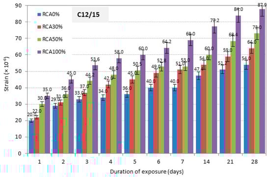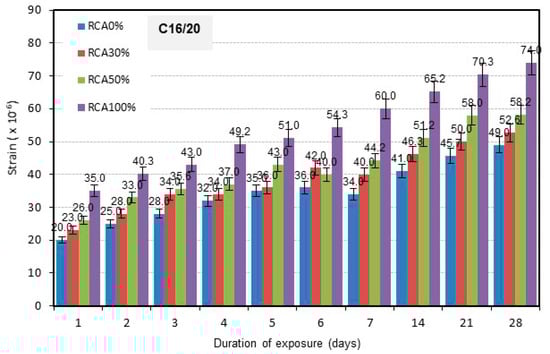 The swelling strains induced by sulphate solution were measured up to 28 days’ immersion, and the results are displayed in Figure 17 and Figure 18. It was found that increasing the curing age and the RCA content in the mix increases the swelling strains magnitude. Overall, sulphate attack mechanism includes the formation of ettringite and gypsum, which expands concrete and induces internal tension that may lead to macro and microcracks in the hardened concrete. As a result of the sulphate attack, incorporating 30% to 50% of RCA showed only a slight swelling while 100% replacement of NCA by the RCA has led to a significant increase of the swelling by around 25 με to reach a total of 74 με and 88 με at 28 days compared with 49 με and 54 με for the control concrete for the C16/20 and C12/15, respectively. For both concrete grades, the full replacement of NCA by the RCA seems to contribute to the increase of the expansion and degrading the concrete’ sulphate resistance.