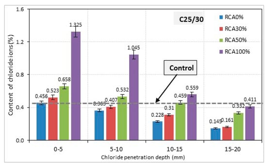 The chloride ingress results of the concrete grade C25/30 are presented in Figure 19 for the RCA-concrete as well as the control concrete. The concentration of chloride is always high near to the surface exposed and it decreases beyond the surface for all concretes examined. It is well known that chloride penetration is strongly related to the w/c ratio, concrete strength, porosity, and the substitution level of NCA by the RCA. The higher the amount of RCA in the concrete, the higher the chloride concentration, especially in the exposed surface as also reported by other researchers [60]. Indeed, the high porosity and low compressive strength of RCA-concrete contributes to this high chloride concentration. The chloride ions from the medium that concrete is exposed to penetrate into the mass of the concrete through the capillary pores and cracks. These two parameters are likely to occur more in concrete with the RCA than NCA. The presence of RCA in the concrete increases the volume and the thickness of the old layer of mortar that adhered to the original aggregates and hence, rises in the total pore volume of the concrete, which gives way for the chloride ions to penetrate into the concrete. This was also reported in previous studies [47] where chloride penetration was attributable to the volume of pores in the attached old mortar on the original aggregate. Also, this volume increase in the old mortar adhered to aggregate increases drying shrinkage and the interfacial transition zone, which leads to an easier and higher chloride penetration, especially in case of full replacement of NCA by the RCA as demonstrated in Figure 19.