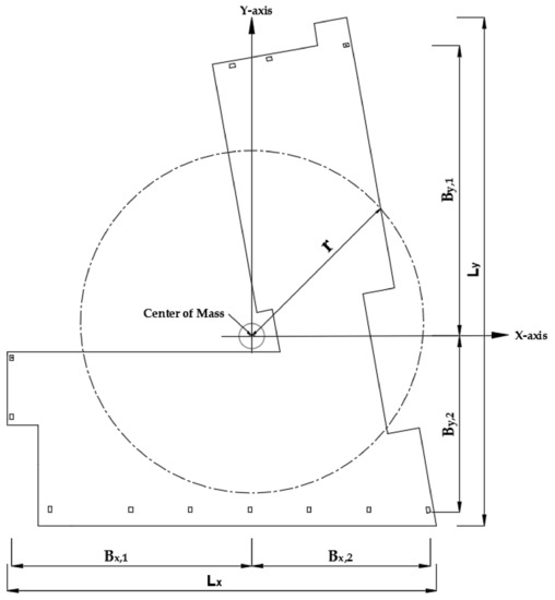 In the coordinate method, a non-self-intersecting closed area bounded by the floor plan of the building is considered, and the coordinates of each vertex of the floor plan are determined. Then, the total area (A) and coordinates of the centre of mass (cx, cy) of the building is calculated using Equations (A1) to (A3). Similarly, the area moments of inertia about two principle axis (Ix and Iy) of the building about the origin (0,0) is determined using Equations (A4) and (A5). The reference point is transformed from origin to CM and the area moments of inertia about the CM are determined using the parallel axis theorem. Similarly, the polar moment of inertia (Iz,CM) about the centre of mass (CM) is determined by using the perpendicular axis theorem, as shown in Equation (A6). Finally, the radius of gyration of the building (r) is determined using Equation (A7).