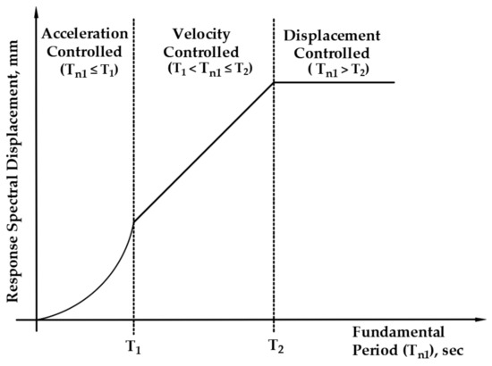 Response spectral displacement diagram with acceleration, velocity, and displacement controlled conditions delimited by the first corner period (T1) and the second corner period (T2).
