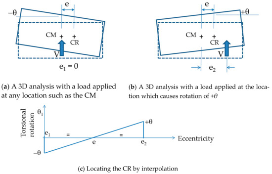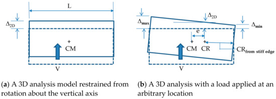 Method (1)–Apply a lateral load (V) to the 2D model of the building at an arbitrary location with the torsional rotation of all the floors restrained. The displacement of the building is accordingly denoted as Δ2D. Repeat the same analysis on a 3D model of the building with the torsional restraint being released and with the same load applied, as shown in Figure 3. The edge displacements are denoted as Δmax and Δmin. The location of the CR can be found using Equation (3).