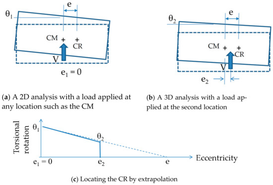 Method (2)–Apply a lateral load (V) to the 3D model of the building at two arbitrary locations in two separate load cases. Take note of the respective torsional rotations θ1 and θ2. The location of the CR can be found by extrapolation to determine the offset at which there are zero rotation results, as shown in Figure 4. The amount of displacement at the CR is equal to Δ2D. Thus, once the location of the CR is known, the value of Δ2D can be determined by scaling the edge displacement values.