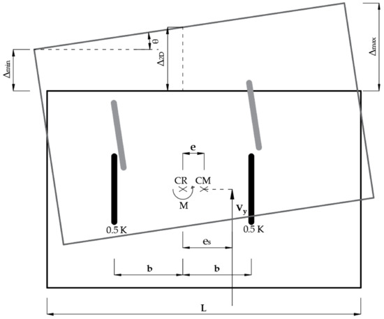 Given that load V is applied at an offset “es” from the CR, the torsional moment is accordingly equal to V es. The torsional and translational stiffness of the building is accordingly obtained using Equations (10) and (11).