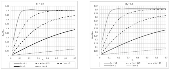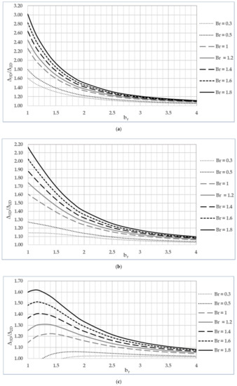 The refined method of assessment comprises three design charts, as presented in Figure 7 for predicting the 3D/2D displacement ratios. These graphs were derived from Equations (14)–(16) for the value of br ranging from 1 to 4, Br ranging from 0.3 to 1.8, and er of 0.7. In this method of assessment, the displacement ratio of the considered multi-storey building can be determined by first calculating the values of Br, br, and determining the controlling conditions as outlined in Section 2.1.1, Section 2.1.2, Section 2.1.3 and Section 2.1.4, and then directly reading the displacement ratio from the graphs presented in the design charts of Figure 7.