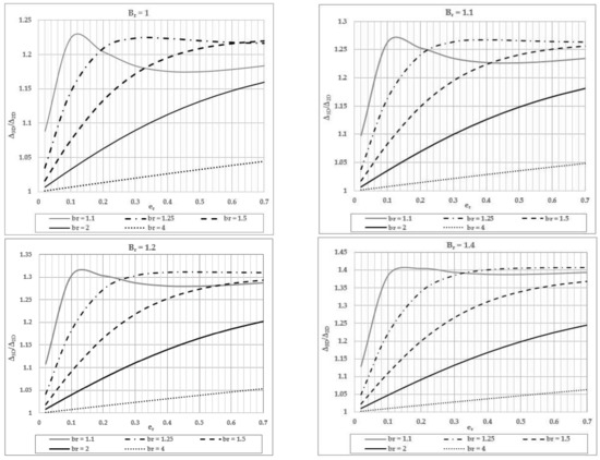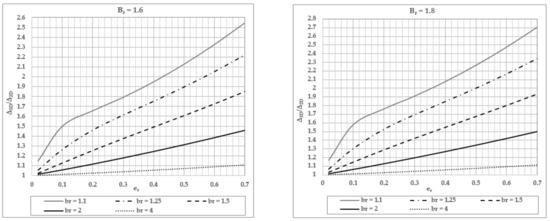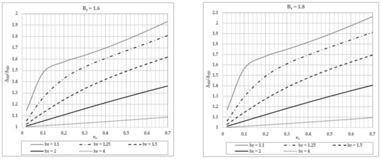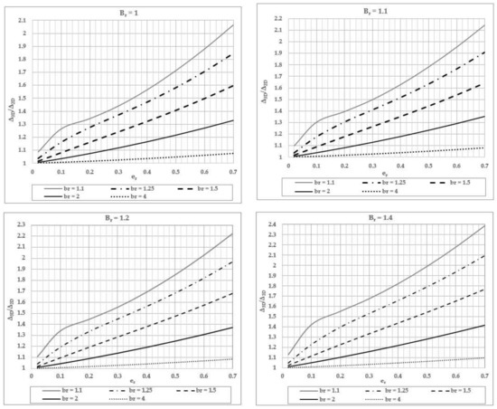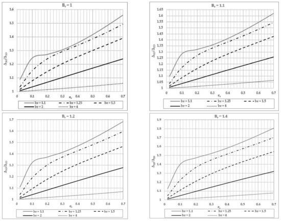 For the detailed method of assessment, three sets of design charts as presented in Figure 8, Figure 9 and Figure 10, which were derived from Equations (14)–(16) for the value of br ranging from 1.1 to 4, Br ranging from 1 to 1.8, and er ranging from 0.01 to 0.7. The edge displacement ratio for a multi-storey building can be found using Figure 8, Figure 9 and Figure 10, based on the values of Br, br, er, and the controlling conditions (refer Section 2.1.1, Section 2.1.2, Section 2.1.3 and Section 2.1.4).