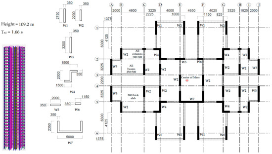 Floor plan, structural layout, and elevation view of CSB 4 (all dimensions are in mm) [29].