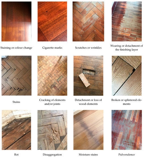 The anomalies observed in wood floorings can be considered a symbol of these degradation factors, which may be caused by natural or human actions, inadequate use, lack of maintenance, or unpredictable events (accidents or vandalism). Figure 1 shows some examples of the anomalies observed in the wood floorings analysed during the fieldwork survey.