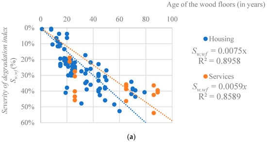 The degradation of wood floorings also occurs due to the action of mechanical or some chemical actions [46]. In the sample analysed, the case studies are not subjected to chemical degradation agents and, therefore, this degradation mechanism is not considered. On the other hand, the use conditions influence the degradation of the wood floorings analysed. Figure 9 shows two degradation curves according to the type of use and to the in-use conditions. First, the analysis of the type of use reveals that wood floorings in services buildings present a higher estimated service life (around 51 years) than floors in housing (with an estimated service life around 40 years). This result reveals that, even though the floorings in services buildings are more exposed to an intense circulation and use, a more frequent and careful maintenance increases their estimated service life.