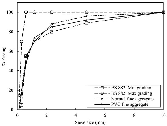 Materials utilized in this study were Type-I cement, normal fine aggregate, PVC fine aggregate (see Figure 1a), normal coarse aggregate, water, PVA (see Figure 1b), and fiber wire mesh (see Figure 1c). Additionally, the mineralogical and chemical compositions of ordinary Portland cement (Type I) used in this study for all mixes are listed in Table 1. The sieve analysis test was conducted to grade the PVC and normal fine aggregates, as depicted in Figure 2. As shown in this figure, the fine aggregates used conform to grading limits following British Standard (BS) 882 [28]. From sieve analysis, the fineness modulus of sand was noticed to be 2.81. The PVC fine aggregate used in this research was collected from PVC plastic sheets accumulated manufacture waste materials. The primary source of the PVC fine aggregate was obtained from the cutting process of PVC sheets and pipes. Thus, the required particle sizes were obtained directly without any additional crushing or refining, as shown in Figure 1a. This form of PVC fine aggregate was beneficial to achieve particle uniformity, improving concrete mix workability. Figure 2 shows that the comparison between PVC fine aggregate and normal aggregate gradings shows that the PVC fine aggregate was very closed to the natural sand. More test results of the used materials in this study are listed in Table 2.