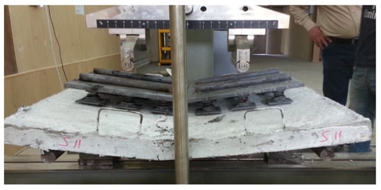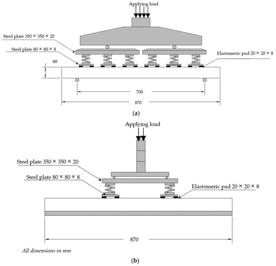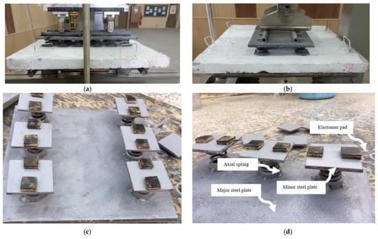 For each mix, the cubes were tested in accordance with EN, B.-12390-2 [43] standard to measure the compressive strengths at 28 days. The splitting tensile strength tests were performed following ASTM C496/C496M-17 [44]. In the flexural slab test, two points of load mechanism were employed to apply uniform load on the slab specimens (see Figure 3). The specimens were located in an MTS material test system machine with a capacity of 670 kN, as shown in Figure 6a. Each load point rests on two steel shafts (30 mm diameter and 300 mm long). The two steel shafts were welded on top of the major steel plate (350 × 350 × 20 mm) and spaced at 150 mm, as shown in Figure 6. The major steel plate was supported by two lines of 200 mm axial springs, as shown in Figure 6c,d, to eliminate the load eccentricity during testing. Each line constituted of three axial springs. At the end of the axial spring, a small steel plate of 80 × 80 × 8 mm was installed. On the other face of the small steel plate, two elastomeric pads of 20 × 20 × 8 mm were glued, as shown in Figure 6d.