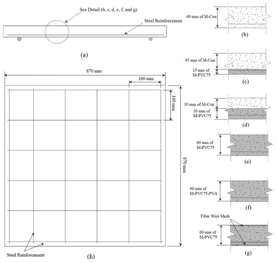 (a) Elevation view, (b) Con, (c) PVC-15, (d) PVC-30, (e) PVC-60, (f) PVC-60-PVA, (g) PVC-60-Fiber, (h) plan view specimens.