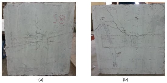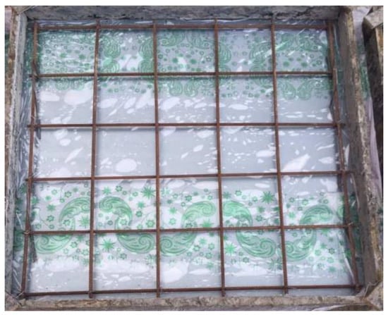 Moreover, a total thickness replacement of 75% sand volume with PVC fine waste aggregates was studied (see Figure 4e). Due to the high dosage of PVC fine waste aggregates in the concrete mixes, a decrease in the slab load capacity might be expected. Therefore, two approaches were used to strengthen the slabs with PVC fine aggregates. The first approach uses PVA to increase the strength capacity of concrete by improving the internal curing [39], as shown in Figure 4f, while the second approach uses two fiber wire mesh layers as an additional reinforcement (see Figure 4g) [41,42]. The embedding fiber wire mesh at the top surface contributes as additional reinforcement in a tension zone, while the bottom fiber wire mesh provides confinement in the compression zone to enhance the reduction in ultimate strength, caused by using PVC fine waste aggregates with high dosage. Besides, in all specimens, the steel reinforcement layer was used at the specimens’ bottom, as shown in Figure 4a,h.