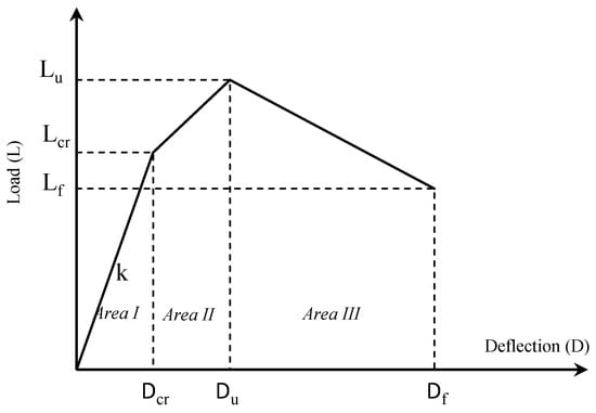 The load was applied until the slab failed. This test setup ensured the load on the slab specimen was uniformly applied. Load and deflection were recorded using a displacement gauge at the center of the slab as the load was applied until failure. Furthermore, to identify in the load-displacement curves, cracking load (Lcr), ultimate load (Lult), and failure load (Lf) stages were depicted in Figure 7. In this figure, the energy absorbed by the slabs was separated into three flexural toughness areas, namely Area I, Area II, and Area III. These areas characterize the flexural toughness for pre-cracking (Area I), cracked before achieving ultimate load (Area II), and post-cracking (Area III). Additionally, the initial stiffness (k) of the flexural load-displacement curve was calculated for the linear portion, as shown in Figure 7.
