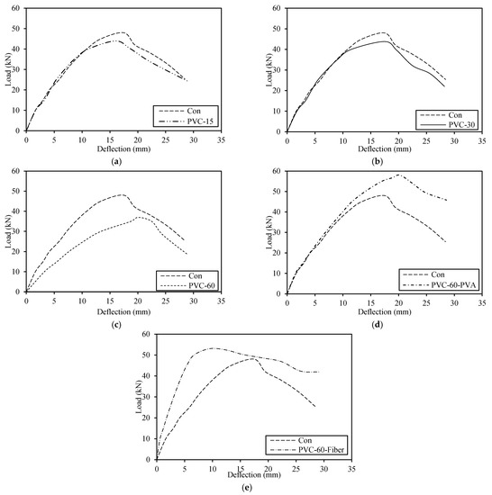 Load-deflection curve of Con specimen with (a) PVC-15, (b) PVC-30, (c) PVC-60, (d) PVC-60-PVA, and (e) PVC-60-Fiber specimens.