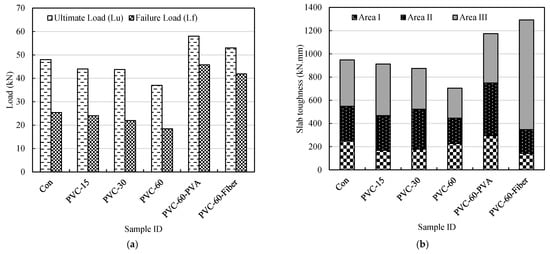 Applying the toughness model introduced in Figure 7 on Figure 8, the flexural toughness of the three areas was computed and plotted in Figure 9b. in Figure 8d,e, the load-deflection are approximately linear until 48 kN and 50 kN for PVC-60-PVA with 100% M-PVC75 concrete and PVC-60-Fiber with 100% M-PVC75 concrete that strength with PVA and fiber mesh, respectively. Then, the notable nonlinear curves with hardening behavior occurred with limited fine crack recorded. After the ultimate load was reached, the softening behavior was recorded until the specimen approached failure. Thus, material or structural enhancement can improve the slab flexural strength of 100% M-PVC75 concrete slab with 75% fine aggregate replacement in the concrete mixture to maximize the use of plastic waste materials.