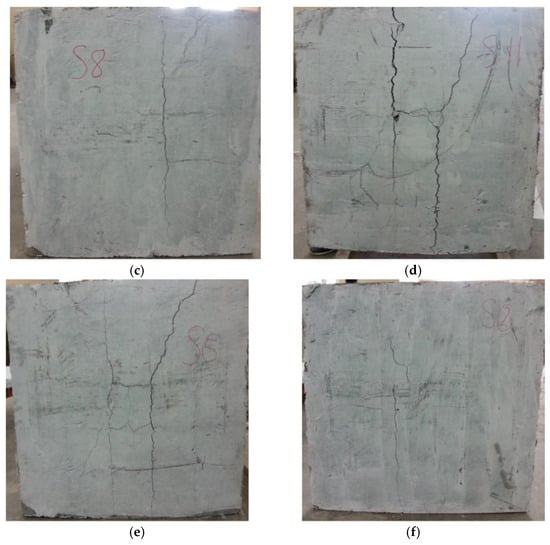 Failure mode of (a) Con, (b) PVC-15, (c) PVC-30, (d) PVC-60, (e) PVC-60-PVA, and (f) PVC-60-Fiber slabs.