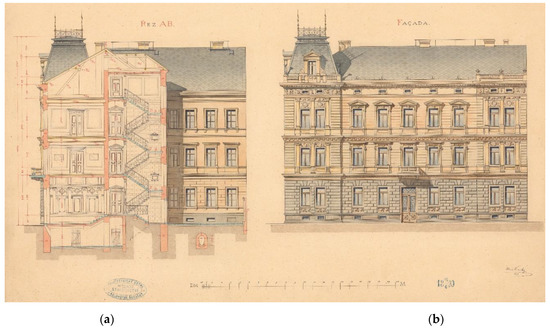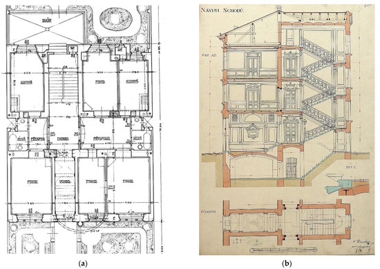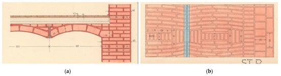 The primary structural function of vertical masonry structures is to transfer the effects of vertical and horizontal loads from individual floor structures through the foundation structure to the foundation subsoil. Tenement houses from the 19th century, but also shops, schools, hospitals, public buildings, etc., were characterized by the longitudinal layout of load-bearing walls, parallel to the street tract. Inside the building, the load-bearing walls formed the so-called middle walls, where the depth of the tracts most often ranged between 4 and 5 m, exceptionally up to 8 m (palaces, public buildings), while internal tracts were usually less than 4 m deep (Figure 3a). The vertical load-bearing structures of urban apartment buildings were most often executed in mixed masonry and, above all, masonry of solid burnt bricks of the so-called classic format of 290 mm × 140 mm × 65 mm [7,8]. In exceptional cases, the walls of overground storeys in buildings from this period could already be built of hollow burnt-clay bricks or hollow brick-like blocks of lightweight concrete (slag concrete or slag pumice), or blocks of another “modern” material. The end of the 19th century was marked by an increase in the use of rolled iron elements (beams, columns, etc.), to be later followed by a global development of concrete and reinforced concrete structures.